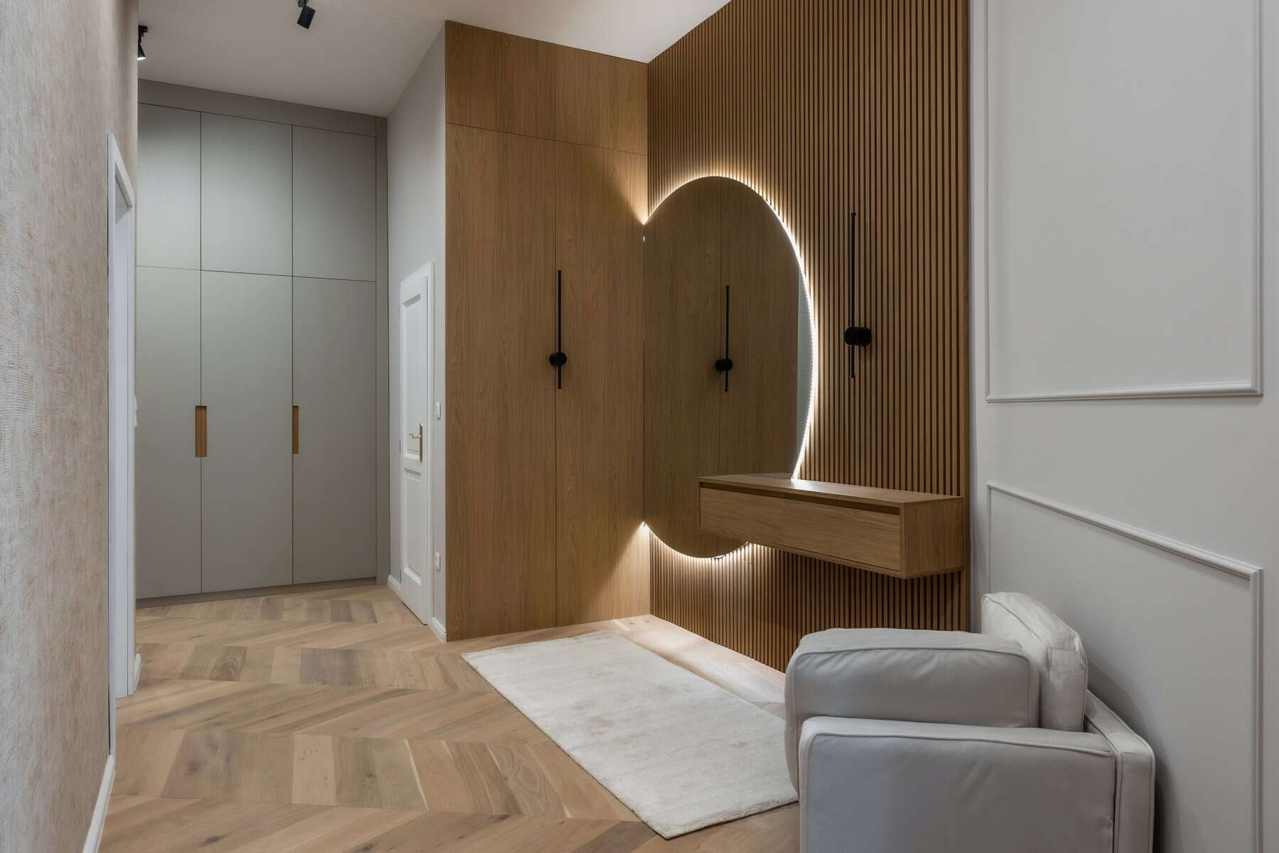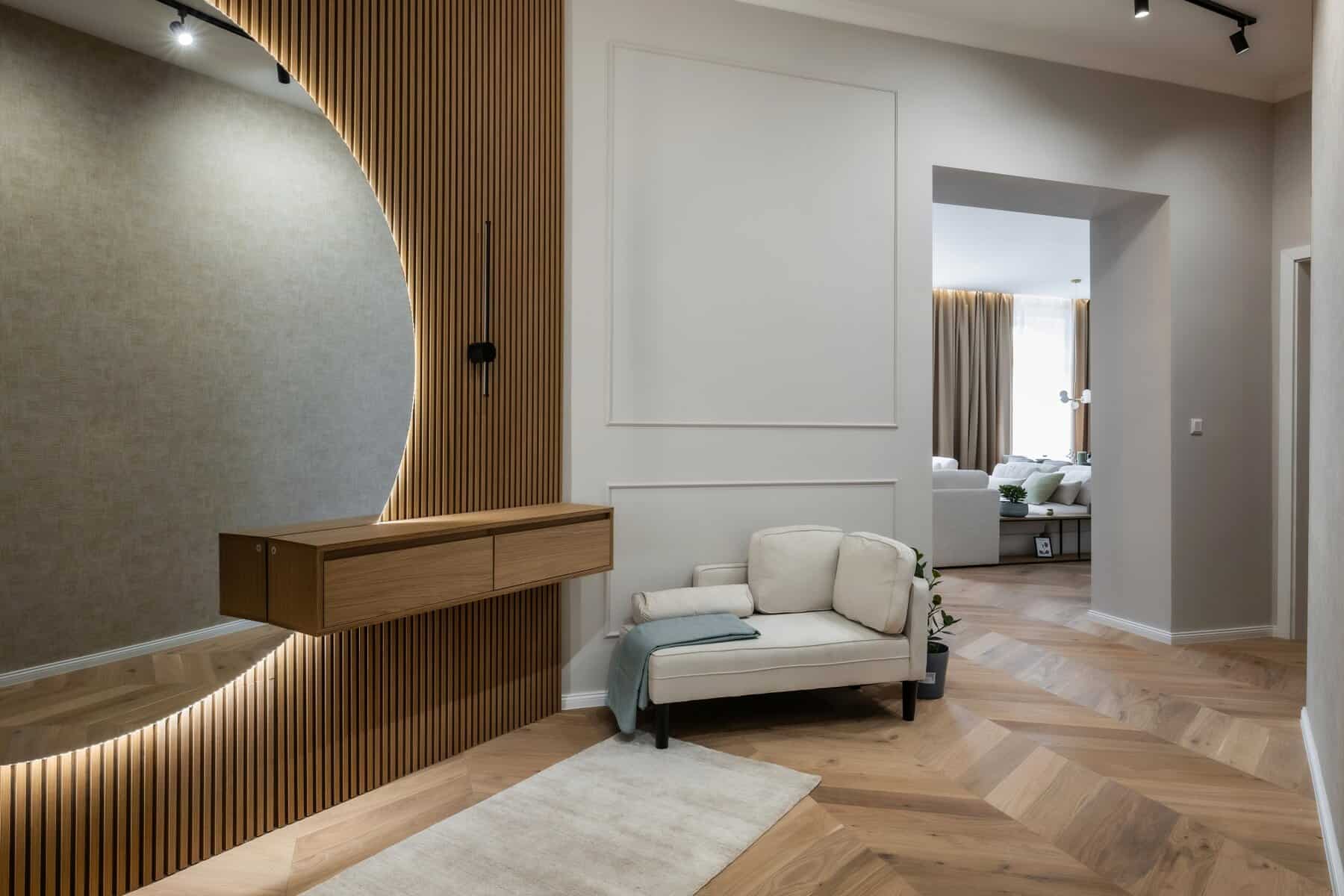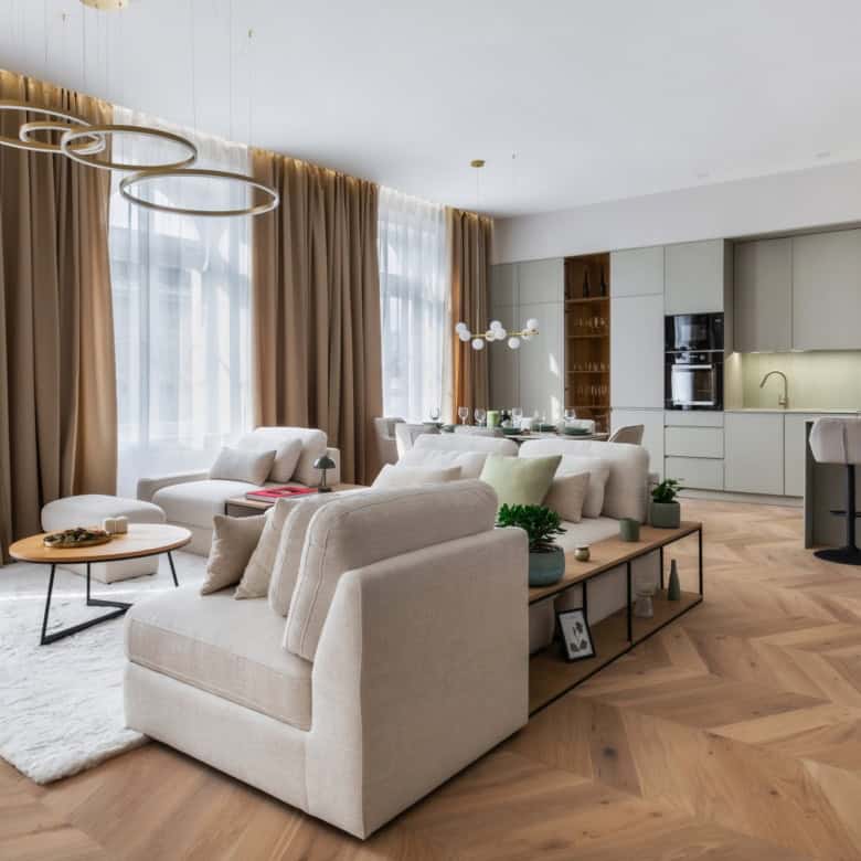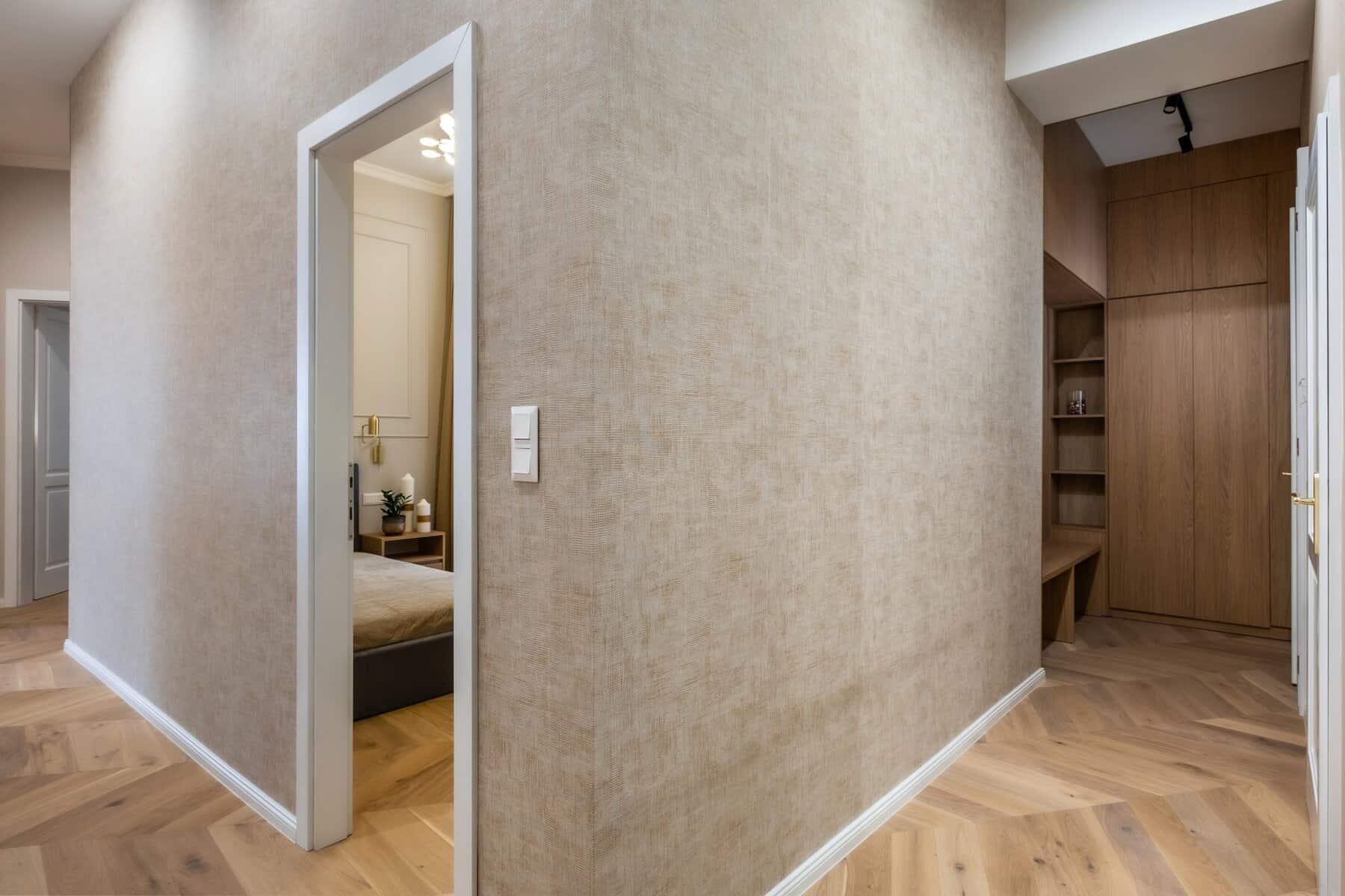Az elegáns, Chevron Renoir 14 mm vastag tölgyfa halszálka parketta meleg karaktert ad az egész lakásnak. A nappali és a lobby impozáns méretű, így akár reprezentatív vendégfogadásra, akár nyugodt otthoni kikapcsolódásra is tökéletes. A gondosan kialakított alaprajz biztosítja a privát és közös terek harmonikus elválasztását, a három hálószoba mindegyikéhez fürdő is tartozik.